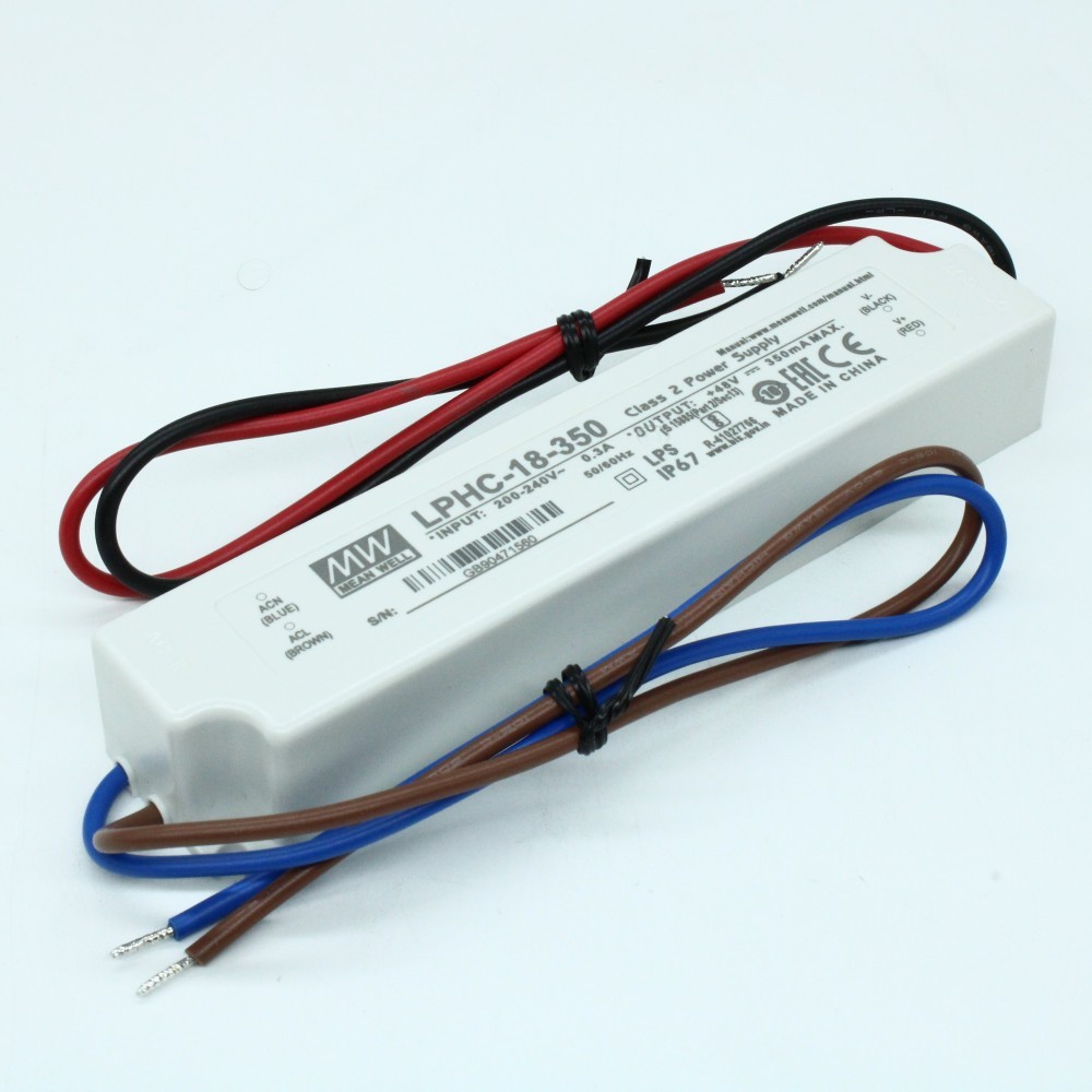 LPHC-18-350, AC-DC led, 16.8Вт, выход 6...48В/350мА, стаб. тока/напр., IP67, вход 180…264В AC, изоляция 3000В AC, в кожухе 140х30х20мм, -30…+70°С